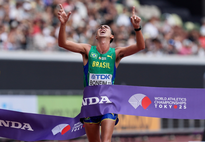 O último dia do Mundial de Atletismo reservou um momento especial para o esporte brasileiro. Na noite desta sexta-feira (19), manhã de sábado (20) em Tóquio, Caio Bonfim tornou-se o maior medalhista brasileiro em campeonatos mundiais e o terceiro a conquistar a medalha de ouro para o Brasil na história do evento. Dizer que o feito de Caio foi repleto de emoção parece óbvio, mas a maneira com que o brasileiro venceu a prova dos 20km da marcha atlética ficará eternizada. Presente sempre no pelotão da frente, Bonfim apertou o ritmo no final, assumiu de vez a ponta no quilômetro final e fez uma entrada apoteótica no Estádio Nacional do Japão até cruzar, incrédulo, a faixa de chegada com o tempo de 1h18min35seg. Nascia ali, um novo ídolo do esporte no Brasil.
